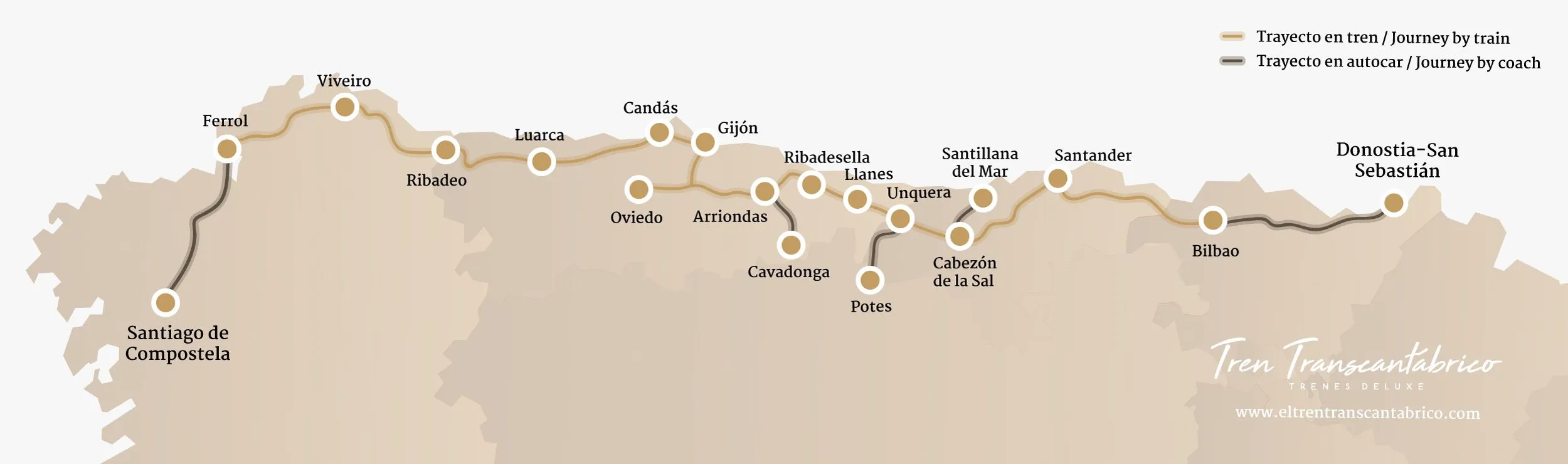 El Tren Transcantábrico realiza un recorrido de 8 días y 7 noches entre San Sebastián y Santiago de Compostela (o viceversa), visitando sitios maravillosos como Santander, Oviedo, Gijón y Bilbao. Una oportunidad muy especial para conocer el Norte de España a bordo de un lujoso hotel sobre raíles rodeado de glamour, con atención exclusiva y máxima comodidad.